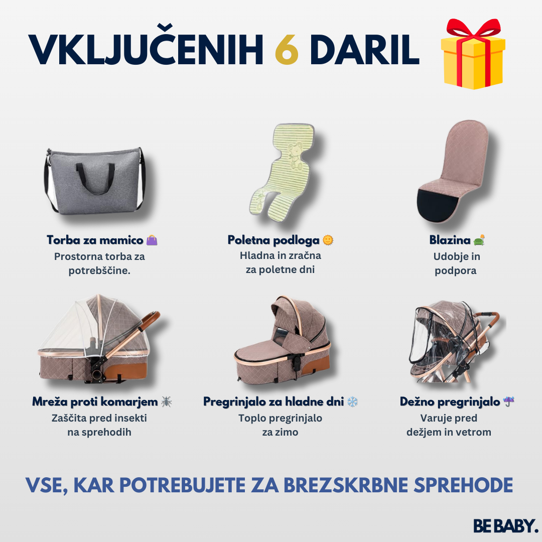 Uz kupnju dobivate besplatnu kiŔnu navlaku, mrežu protiv insekata, torbu za mame i ljetnu podlogu - sve za poboljŔanje vaŔeg iskustva.