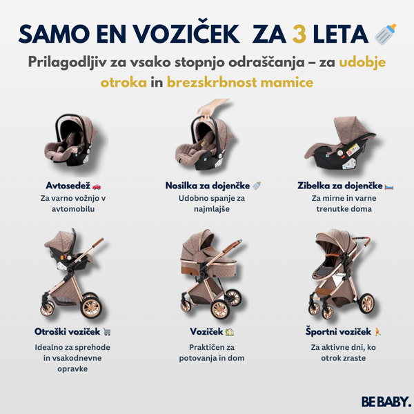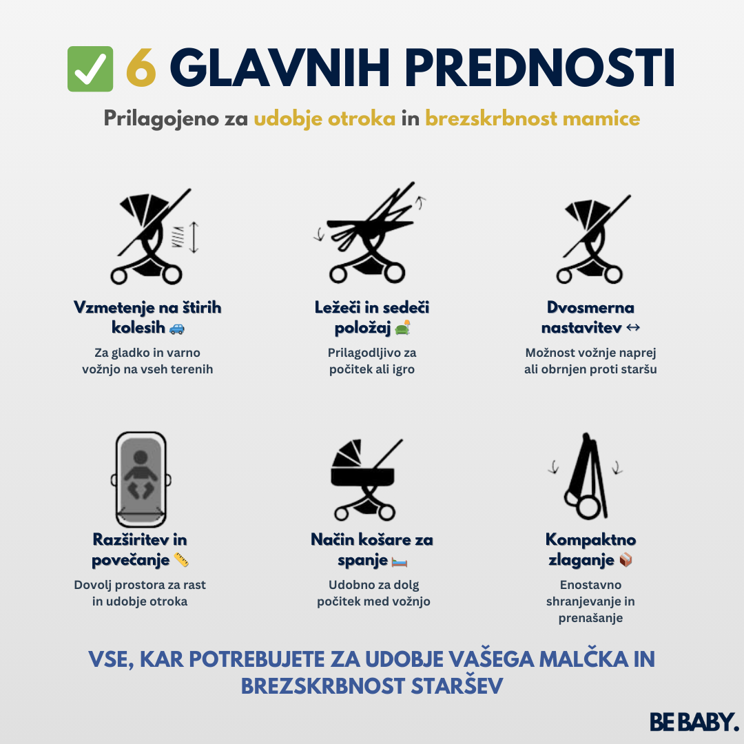 Izdvaja se zbog svoje svestranosti i cijene - kombinira koÅ”aru, kolica i autosjedalicu u jednom elegantnom dizajnu. Također nudi vrhunsku udobnost, stil i sigurnost.