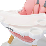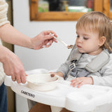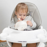 Tuva je izrađena od visokokvalitetnih materijala, što ga čini izdržljivim i sigurnim. Ima pojaseve s pet točaka i dodatnu zaštitu na pladnju koja sprječava klizanje djeteta. Briga za udobnost djeteta i roditelja, stolica ima dvostruki, podesivi pladanj s dva mjesta za šalicu. Sjedalo je mekano i lako za čišćenje.