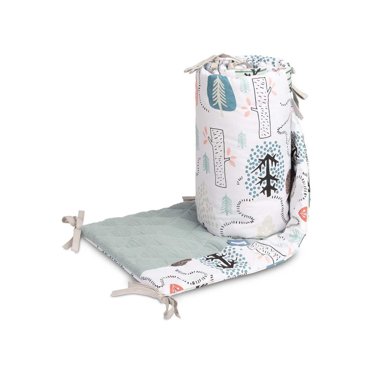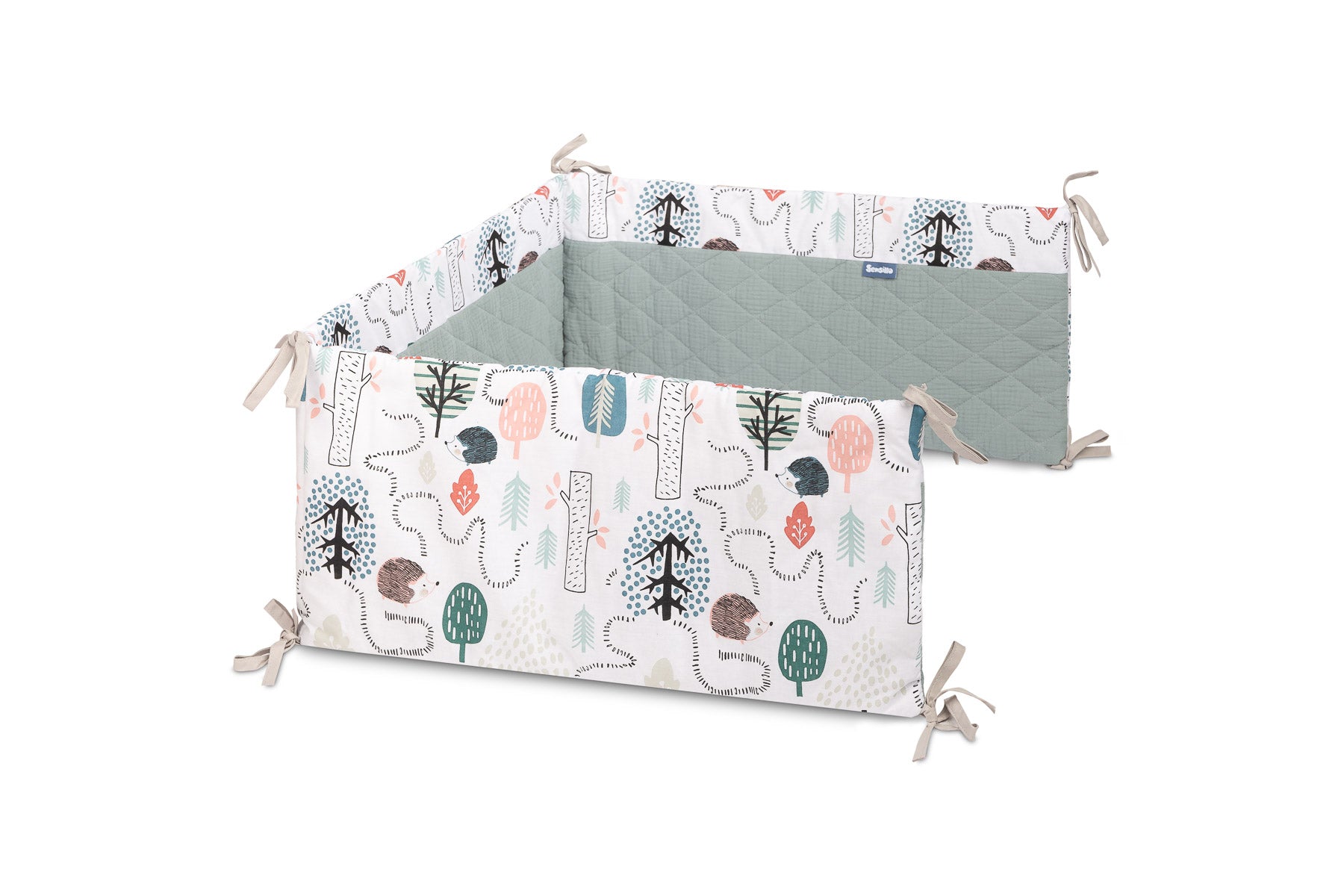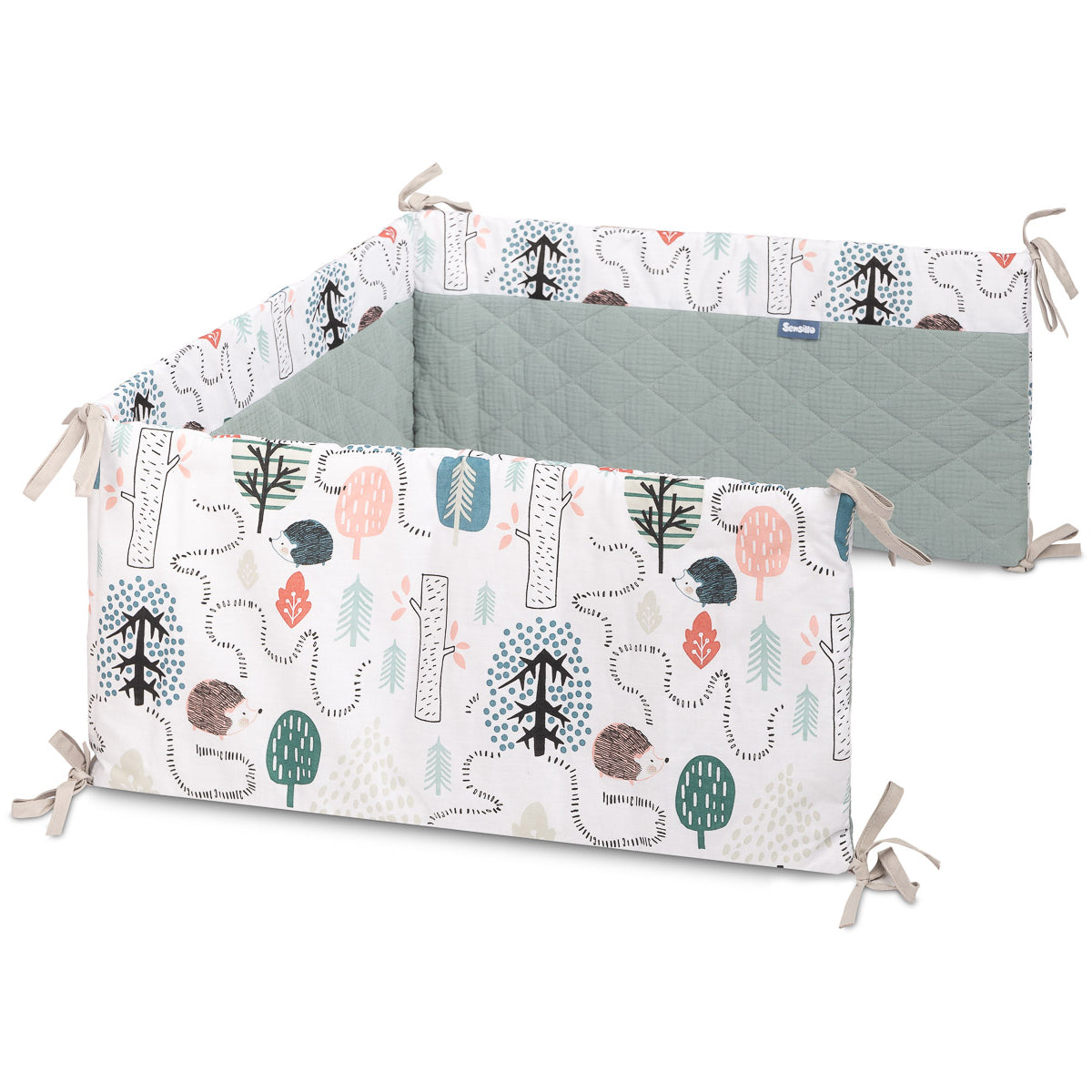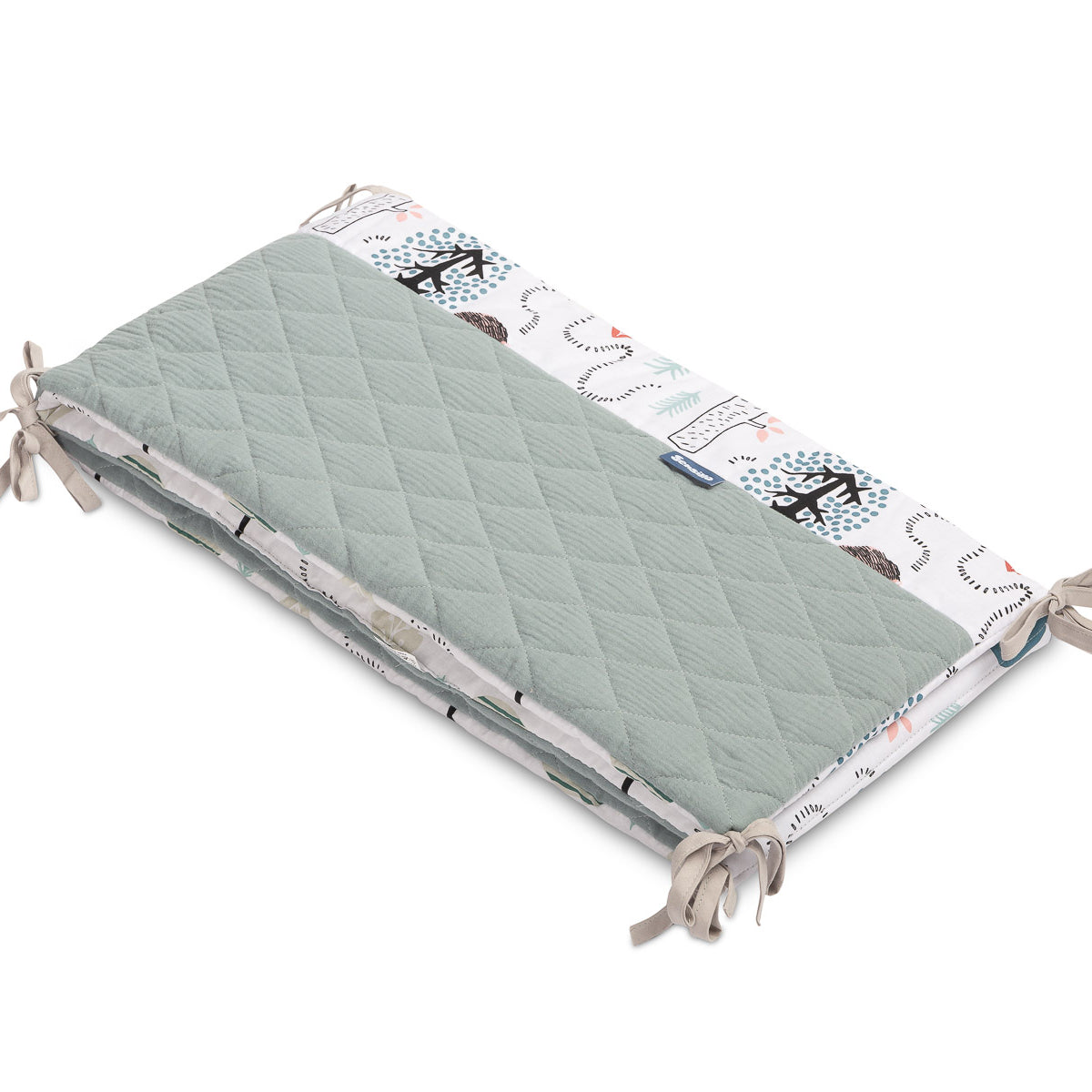Zaštitna obruba za krevetić pristaje svakom standardnom dječjem krevetiću. Obruba je izrađena od mekog tiskanog pamuka i ugodnog muslina na dodir. Punjenje od poliestera zaštitit će bebu od ozljeda tijekom kretanja po krevetiću. Obruba ostaje na svom mjestu zahvaljujući trakama kojima se pričvršćuje na prečke krevetića. Namijenjena je za krevetić dimenzija 120x60 cm. Obruba će biti izvrstan dodatak dječjoj opremi.