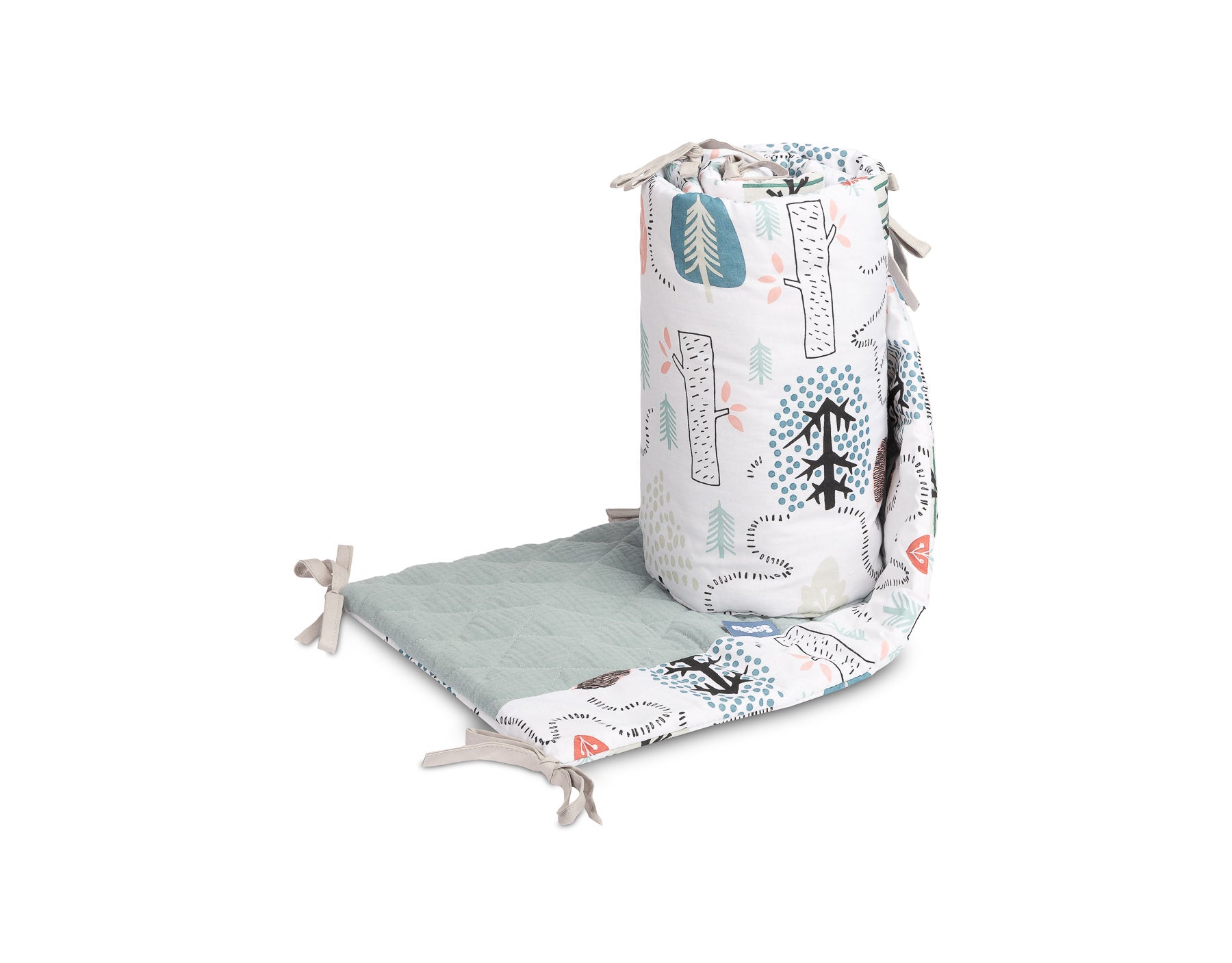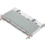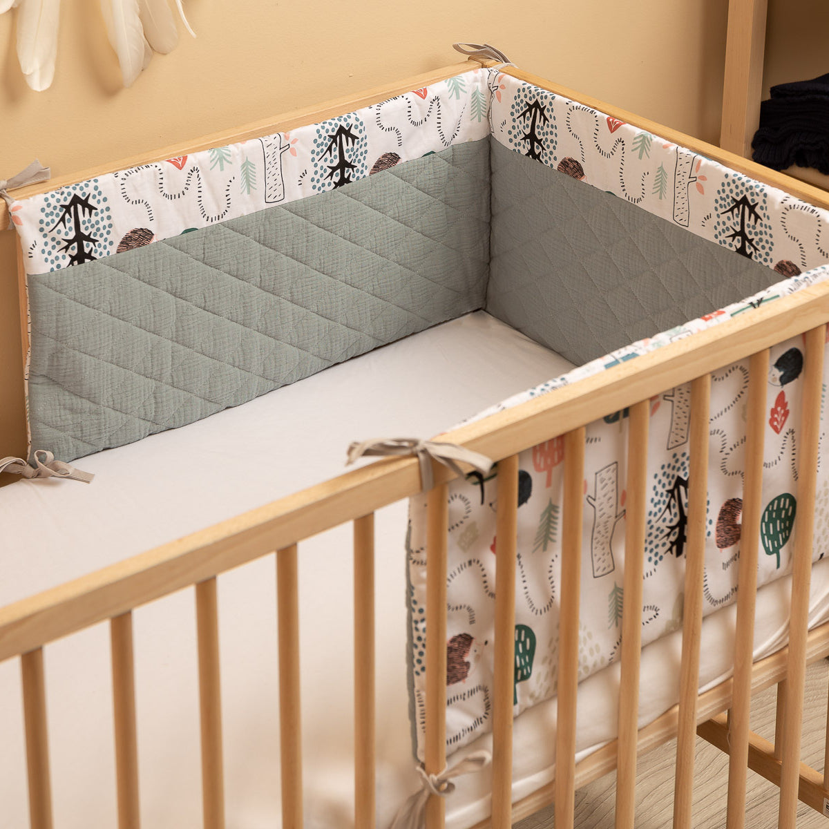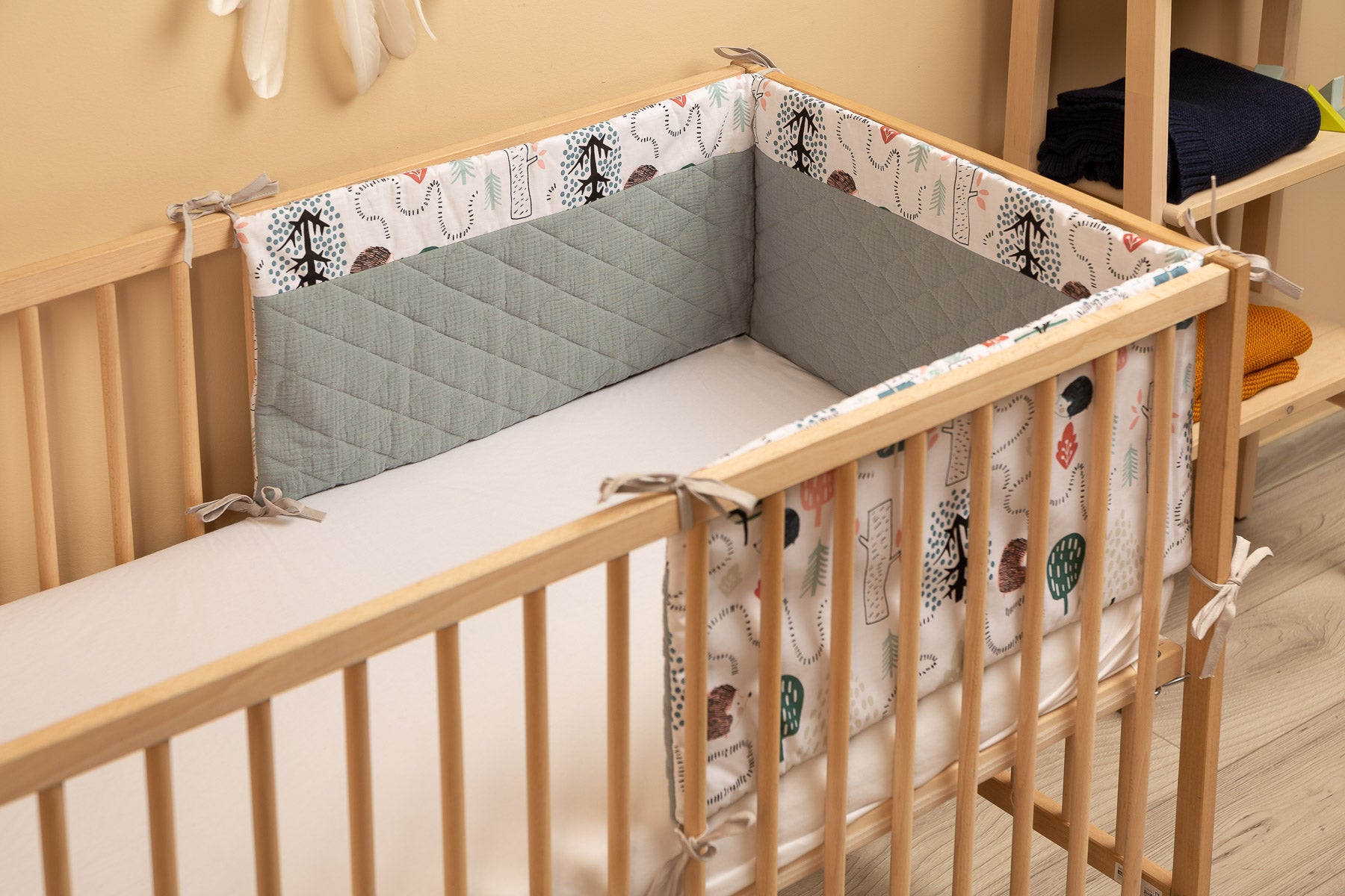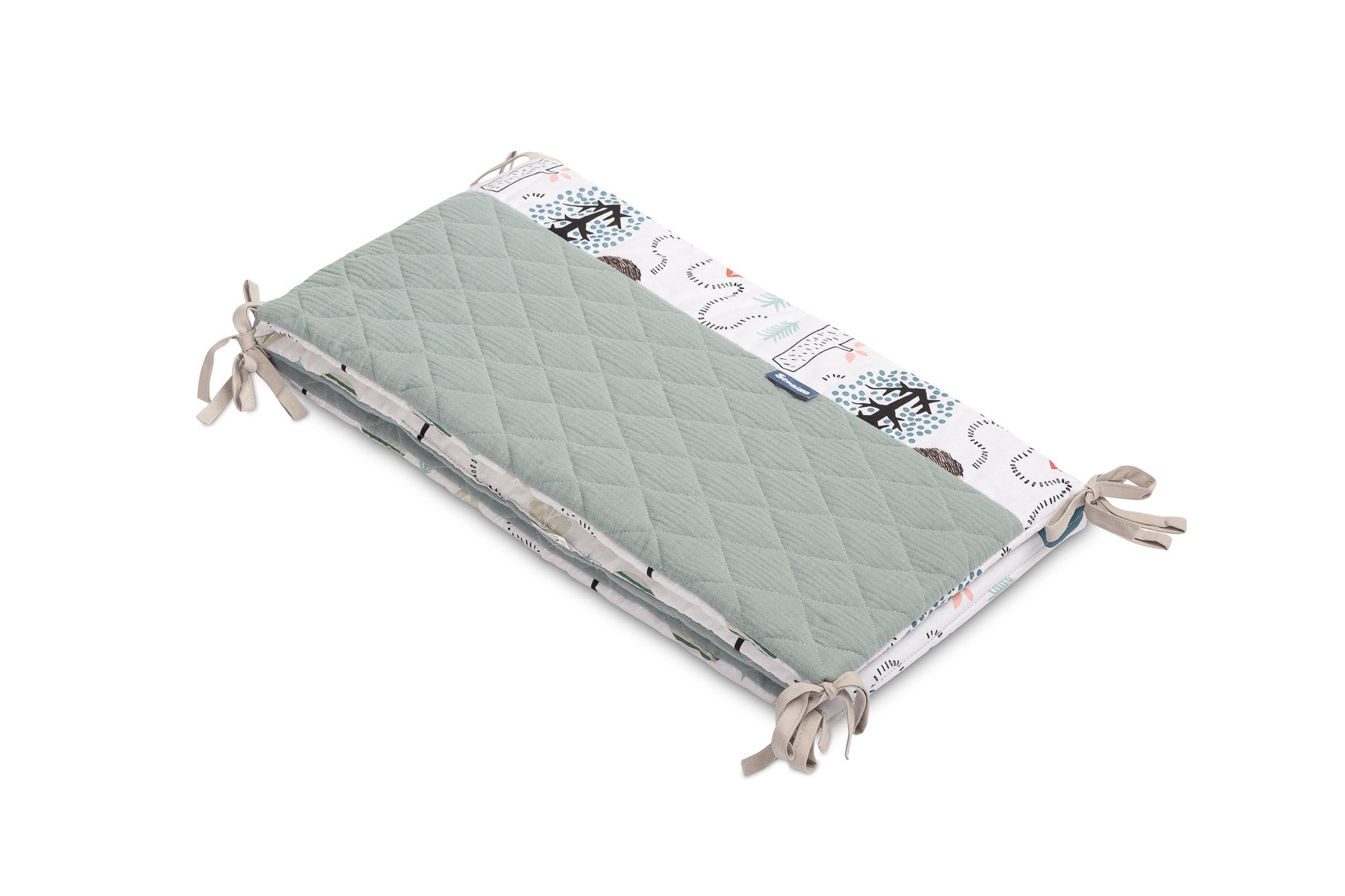 Zaštitna obruba za krevetić pristaje svakom standardnom dječjem krevetiću. Obruba je izrađena od mekog tiskanog pamuka i ugodnog muslina na dodir. Punjenje od poliestera zaštitit će bebu od ozljeda tijekom kretanja po krevetiću. Obruba ostaje na svom mjestu zahvaljujući trakama kojima se pričvršćuje na prečke krevetića. Namijenjena je za krevetić dimenzija 120x60 cm. Obruba će biti izvrstan dodatak dječjoj opremi.