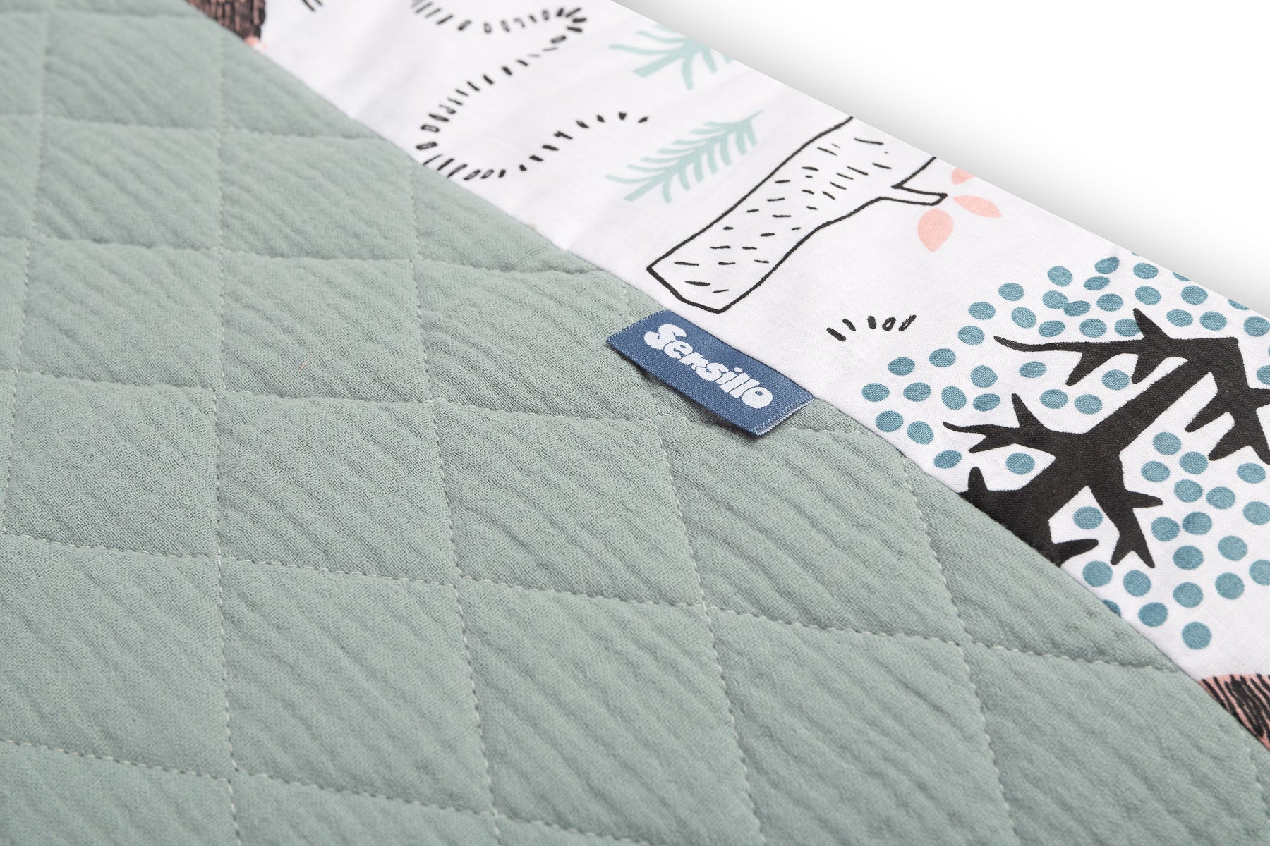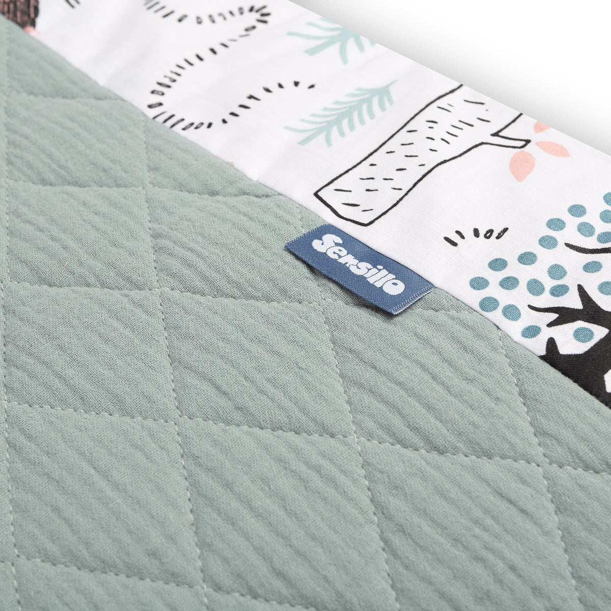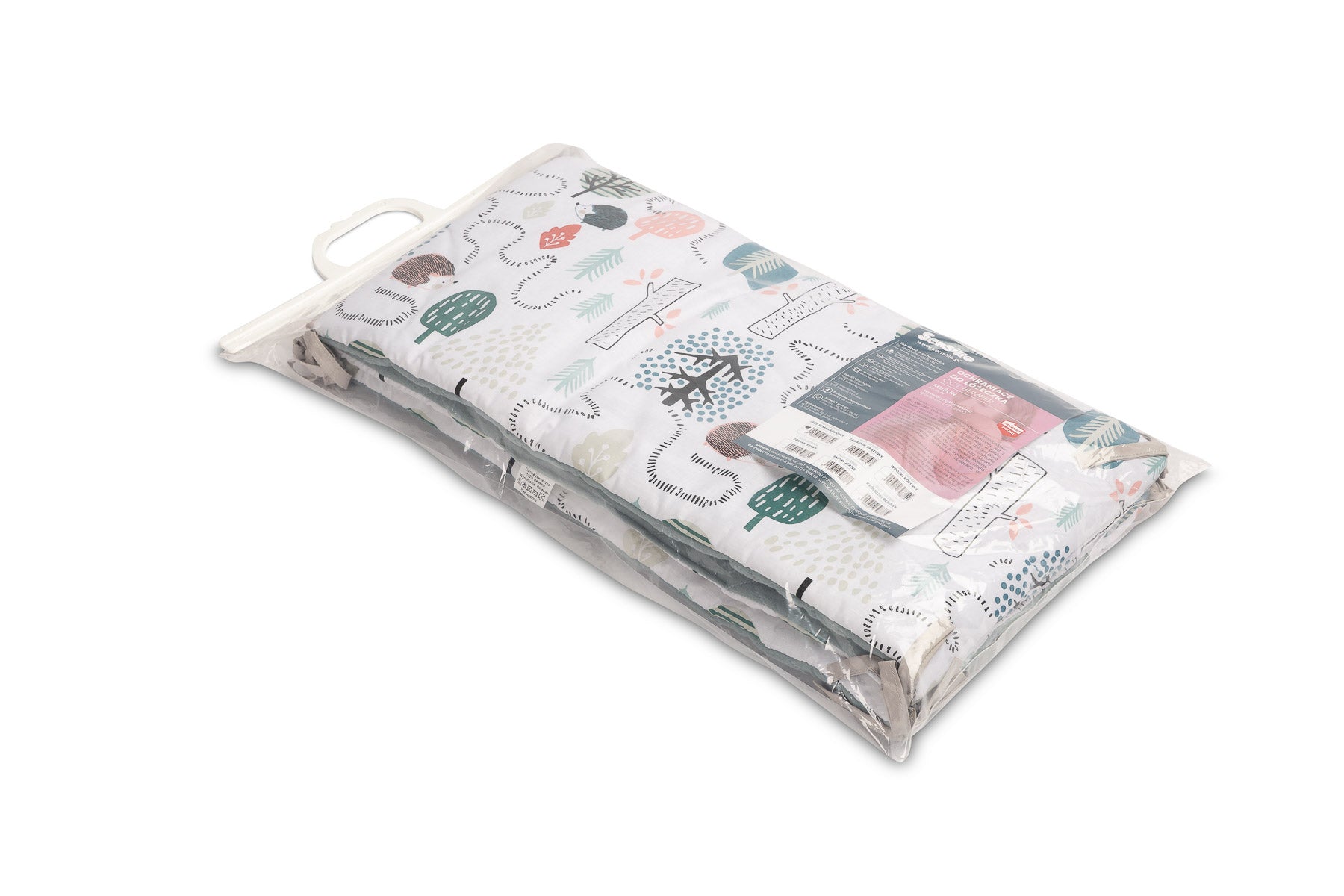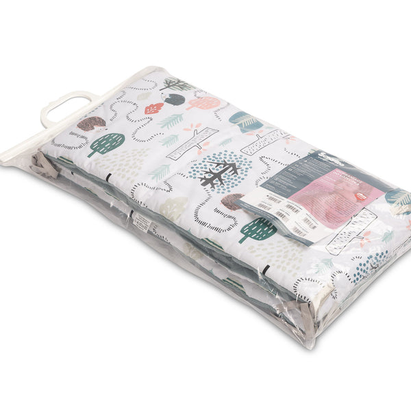 Zaštitna obruba za krevetić pristaje svakom standardnom dječjem krevetiću. Obruba je izrađena od mekog tiskanog pamuka i ugodnog muslina na dodir. Punjenje od poliestera zaštitit će bebu od ozljeda tijekom kretanja po krevetiću. Obruba ostaje na svom mjestu zahvaljujući trakama kojima se pričvršćuje na prečke krevetića. Namijenjena je za krevetić dimenzija 120x60 cm. Obruba će biti izvrstan dodatak dječjoj opremi.